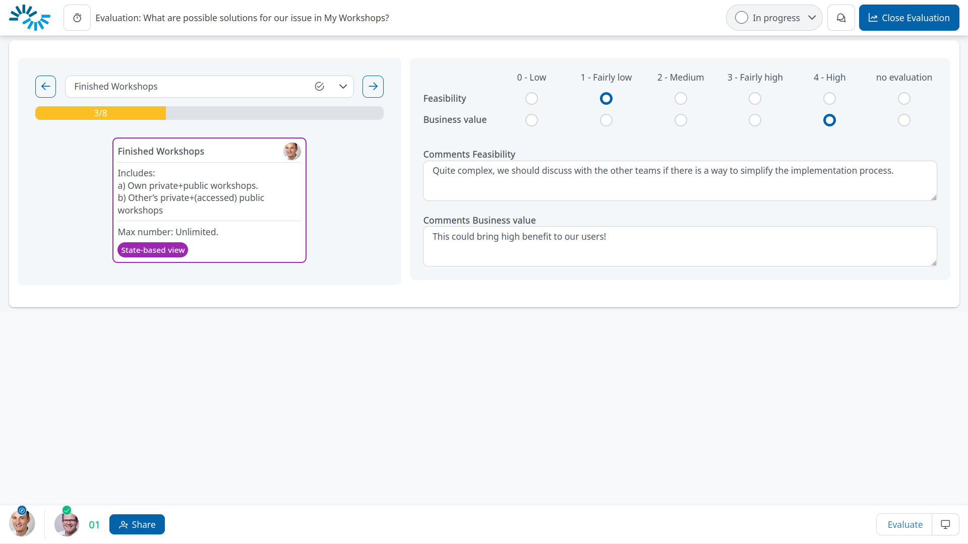 We’re excited to announce the redesigned evaluation page for IdeaClouds, our collaborative decision-making tool. This update brings several improvements aimed at enhancing your experience during the evaluation process: Streamlined Rating: We’ve combined the evaluation of two criteria (e.g., Effort and Benefit) into a single step, simplifying and speeding up the process. Progress Bar: A…