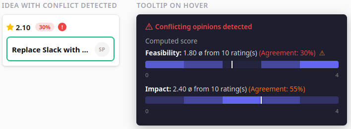 The agreement badge is shown on the top 5 ranked cards, the ideas you are most likely to act on first. For all other cards, the agreement percentage is available in the tooltip by hovering over the score. The red conflict icon (!) appears on every card regardless of rank, so polarizing ideas are never invisible.