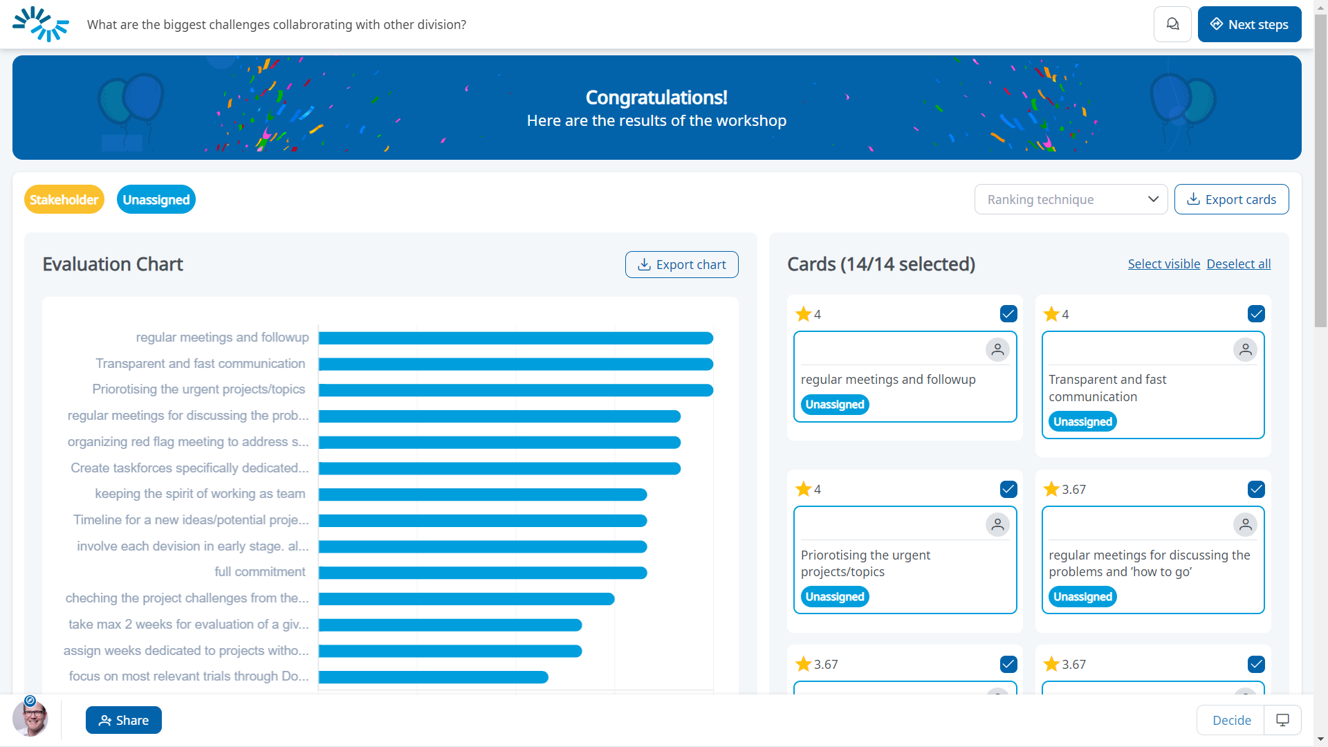 - Finish the evaluation phase and discuss the ideas with little agreement, which are further down in the ranking on the result page